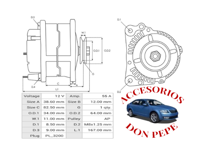 APLICACIÓN: 12V 55A – ANCLAJE 82 – TRACTOR FORD 5000, NEW HOLLAND, FORD FIESTA 1.3 – 0120489050, 110178, 111086, 111364, 66021137, 66021637, 0120489244, A4108, A4119, 12072N1G, 12074N