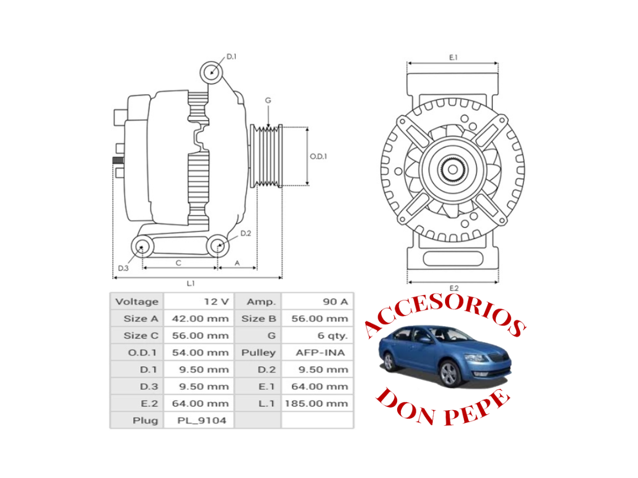 APLICACIÓN: ALTERNADOR VALEO 12V, 90A, POLEA RUEDA LIBRE 6PK, ALFA ROMEO 08 15, CITROEN 10 15, FIAT 03 15, FORD 08 15, SUZUKI 03 15, 23325, 23792, 23922, 23923, 23924, 101210-1180, 101210-1190