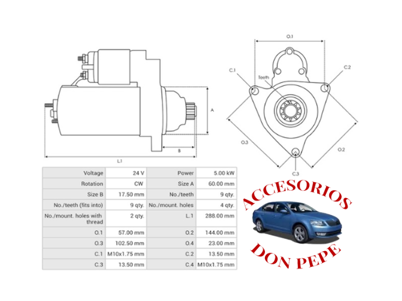 APLICACIÓN: MOTOR VALEO 24V.9 DIENTES – PIÑON 36MM – BOCA 60MM OREJAS 145MM HYUNDAI MIGHTY 3 COUNTY HD65 HD78 D4D DIESEL